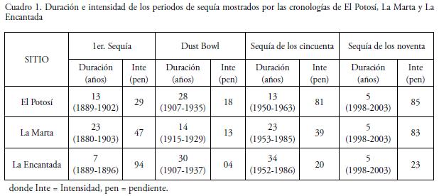 De las sequías que se presentaron en el siglo XX y parte del XIX, en general, en los tres sitios se marcan magnitudes importantes (Cuadro 1). En cuanto a la primera sequía reconstruida en La Encantada, se observa la duración más corta (siete años) pero la mayor intensidad, indicada por una fuerte pendiente (94; Cuadro 1, Figuras 2 y 3). En el periodo de principios del siglo XX, Dust Bowl, en las tres cronologías se observa una erraticidad importante y la sequía más intensa se observa para El Potosí, mientras que en la Encantada ésta muestra poca intensidad con una pendiente bastante baja (04). Cabe aclarar que a pesar de que en este sitio la ocurrencia de sequía no cubre el tiempo indicado para este término (1930s Dust Bowl), por cuestiones prácticas de interpretación en este estudio, se designó igual que en los otros dos casos. La pendiente del Dust Bowl en La Encantada se presenta con una serie de interrupciones de precipitaciones importantes. La sequía de los cincuenta en general dura de 1949 a 1962 para las tres cronologías, aunque se prolongó por más tiempo en La Encantada, con 34 años con varias interrupciones importantes, pero fue más intensa en El Potosí, con una pendiente mucho más pronunciada. Respecto a la sequía de los noventa, se observa una intensidad bastante fuerte en El Potosí y La Marta con pendientes de 85 y 83, respectivamente, mientras que en La Encantada la intensidad fue mucho más baja (23).