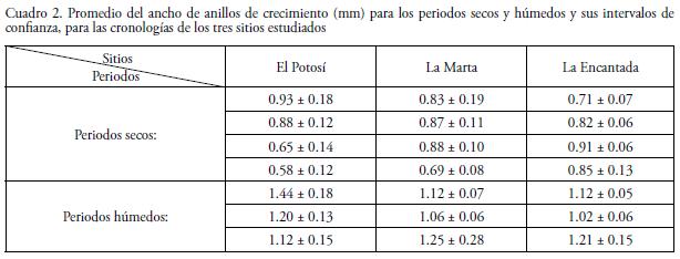 El incremento promedio de los anillos en los periodos húmedos para los sitios de El Potosí, La Marta y La Encantada son: 1.25, 1.16 y 1.14, respectivamente. Mientras que los promedios en los periodos de sequía son: 0.76, 0.84 y 0.86 para las mismas dendrocronologías, respectivamente (Figuras 2, 3 y 4; Cuadro 2). Lo anterior indica que de manera similar en los tres sitios, existe una importante reducción de la productividad durante las condiciones de sequía.