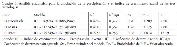 Los análisis estadísticos muestran que de los tres sitios estudiados, La Encantada tiene el valor más alto de R2 ajustada, que explica el 37% de los datos analizados con un error de 0.7 mm (Cuadro 3). Sin embargo, El Potosí, a pesar de contar con un 25% de la explicación de variación de sus datos, presenta una mejor correlación, mayor que la de los otros dos sitios, arrojando un valor 0.0014 en la Pr >F. Esto se explica por la mayor cantidad de información presente en dicha cronología. Estadísticamente, la cronología que tiene la mejor asociación con la precipitación invernal es la de El Potosí seguida de la de La Marta y por último la de La Encantada (Cuadro 3).
