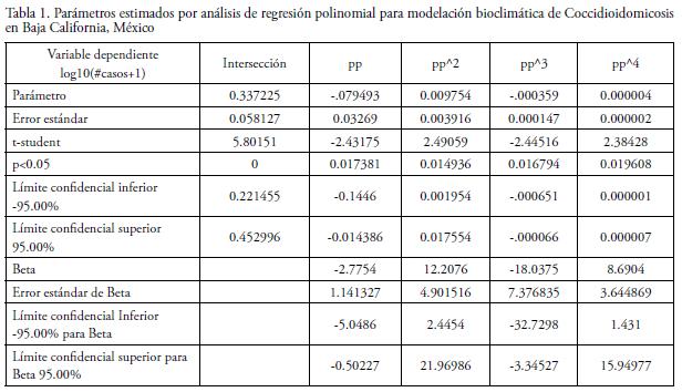 Al explorar la relación entre la precipitación pluvial y el número de casos reportados de Coccidioidomicosis en Baja California, la información disponible se ajustó al modelo de regresión polinomial de cuarto orden (p<0.05; Tabla 1, Figura 5), con la siguiente expresión: