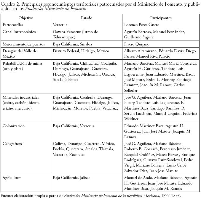 Finalmente, más vinculados al objetivo de nuestro estudio, se halla la reciente publicación de García Rojas (2009) intitulada Historia de la visión territorial del Estado mexicano, así como la tesis de Lucero Morelos (2010) que nos muestra el vínculo establecido por tres de los ingenieros más destacados del siglo XIX con el Ministerio de Fomento en la realización de estudios geológicos en buena parte del país.