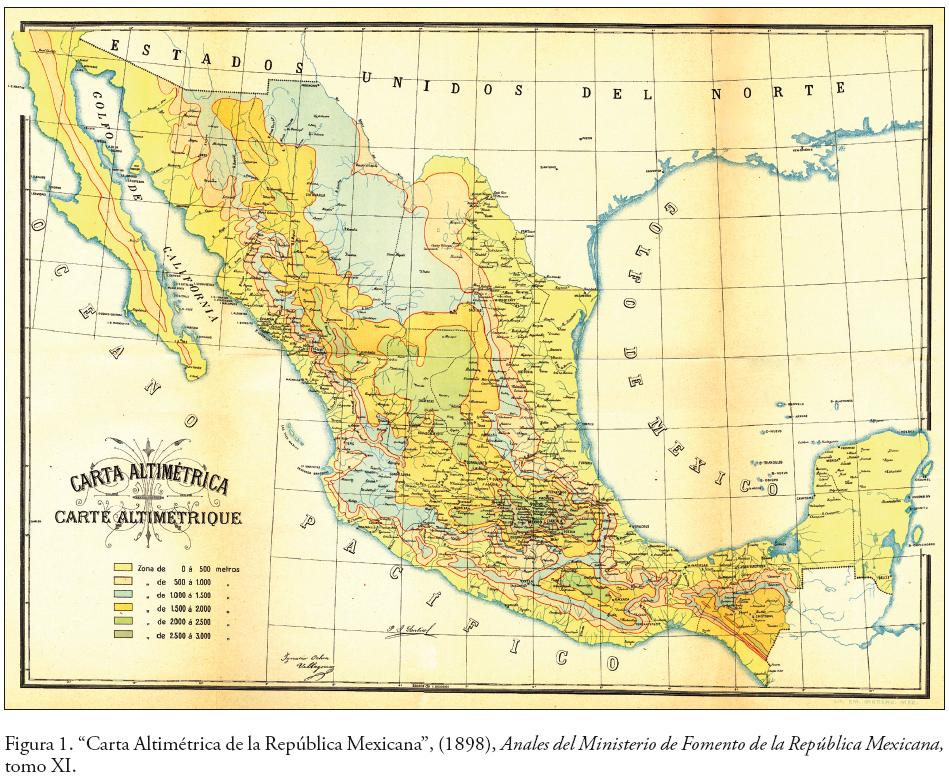 Por lo que respecta a los trabajos de Fomento para avanzar en la cartografía nacional, el ministerio dispuso en 1877 el nombramiento de comisiones científicas que se encargaran de "fijar astronómicamente los puntos más importantes de la república, a la vez que su latitud, aprovechando el paso por los conductores telegráficos, con el objeto de establecer bases para la gran triangulación de México" (Anales, T. I, 1877:5253). Dentro de los informes publicados se encuentran estudios de las posiciones geográficas de Querétaro, Zacatecas, Durango y Mazatlán (Anales, T. IV, 1881:273298); el levantamiento de una carta altimétrica (Figura 1) y otra climatológica de toda la república, publicadas por el ministerio en 1898, donde las regiones peninsulares de Baja California y Yucatán aún no se representan con todos sus detalles, pero nos dan una idea del avance y la importancia que se daba a estos trabajos. Asimismo, en todas las expediciones instrumentadas por Fomento, se estipulaba que se debían hacer los planos pertinentes, así como el estudio geológico del lugar.