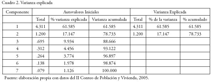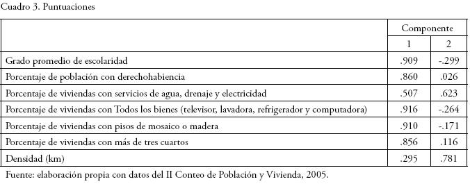 El método construyó dos factores que explican el 78.7% del total de la varianza, lo que indica una fuerte representatividad de los mismos. El primero de ellos aglutina al 61.6% de la varianza y se conforma principalmente por las variables Porcentaje de Viviendas con Todos los Bienes, Porcentaje de Viviendas con Piso de Mosaico y Grado Escolar Promedio. Por su parte el segundo factor (17% de la varianza) se conforma por las variables Densidad y Porcentaje de Viviendas con Todos los Servicios (Cuadros 2 y 3; Figura 5).