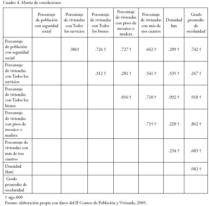 La variable con número de relaciones significativas es la de Grado Escolar (Cuadro 4), siendo la más fuerte la existente con viviendas con todos los bienes, le siguen en ese orden de importancia las variables de viviendas con pisos de mosaico o madera, población con seguridad social y viviendas con tres o más cuartos. En otras palabras, este conglomerado habla de las condiciones de mayor bienestar.