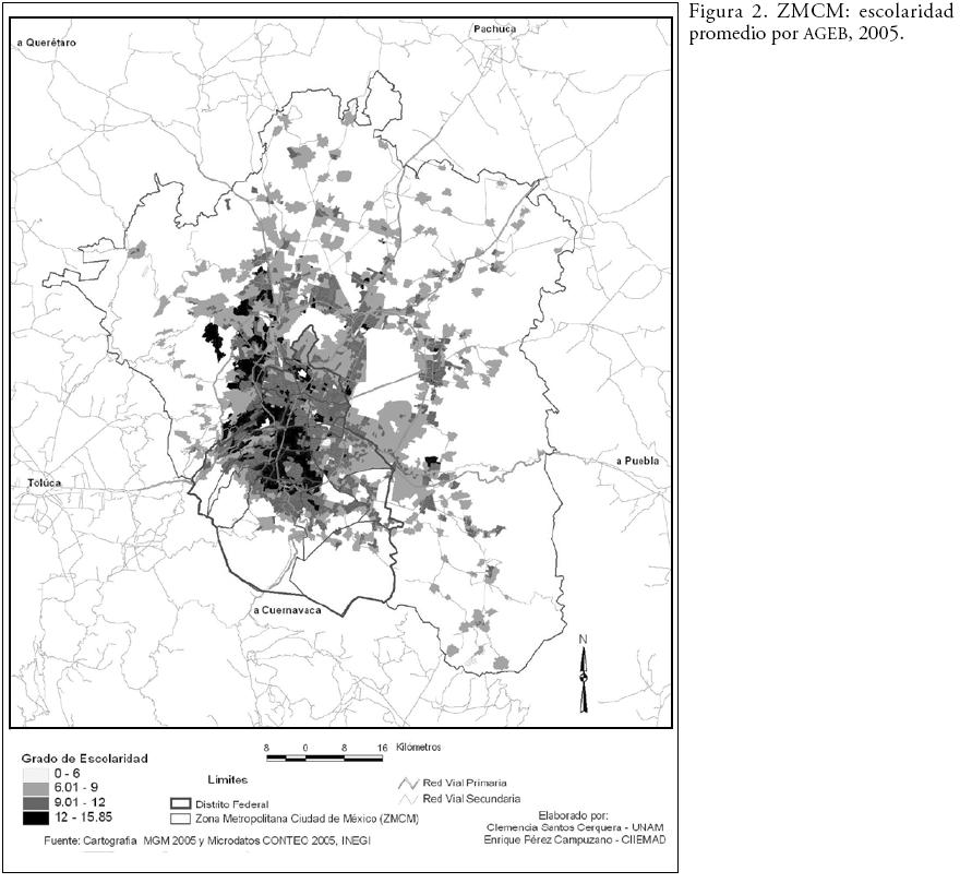 La ZMCM presenta un patrón diferencial en términos de niveles educativos. El grado escolar en ella es un poco más alto al obligatorio (9.51 años) y con una desviación típica de dos años. En otras palabras, el promedio escolar de la población no llega a terminar el grado superior. En términos espaciales, las diferencias se hacen palpables. Se puede percibir una herradura que inicia en Tlalpan límites con Coyoacán, incluyendo esta delegación, pasa por Benito Juárez y termina en la Zona de Santa Fe (delegaciones de Álvaro Obregón y Magdalena Contreras y Municipio de Huixquilucan), por un lado, y un polo en la parte de Naucalpan y Cuautitlán Izcalli, por el otro. Ambos presentan los niveles educativos más altos. En la periferia existen los niveles menores de escolaridad promedio, destacándose el oriente y norte (Cuadro 1 y Figura 2).