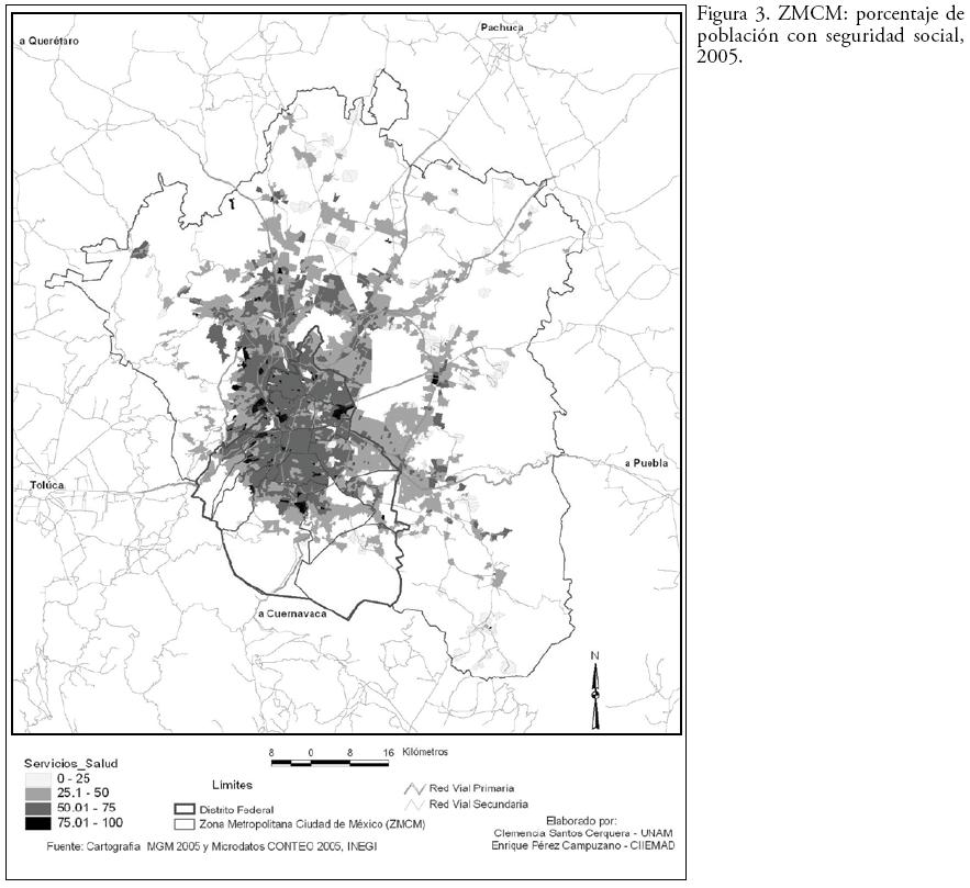 Por otra parte, el porcentaje de personas sin derechohabiencia llega prácticamente a la mitad de la población en la ZMCM, sin embargo, las diferencias son igualmente significativas; los mayores porcentajes de población sin ningún tipo de servicio médico se encuentran en la periferia oriente, norte y nororiente (Cuadro 1 y Figura 3).