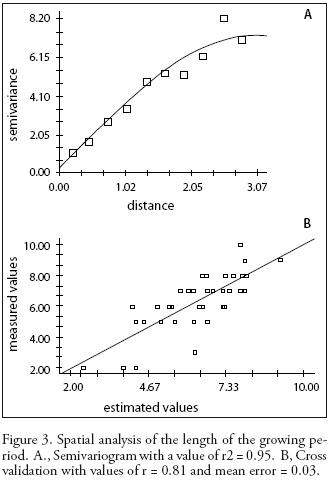 A georeferenced matrix was created with the average LGP (19612003) for each climatology station. The spatial analysis was performed with GS+ software (Gamma Design Software, 2006). First, the experimental semivariogram was produced in order to select the best theoretical model; then points were interpolated by kriging by points in order to produce a map at a scale of 1: 250 000; lastly, a cross validation of the interpolation and the measured points led to calculation of the mean error (ME).
