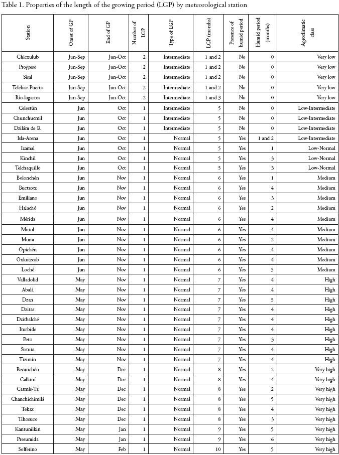 The definition of zones in the state of Yucatán in terms of the LGP is an approximate indication of the intraannual pattern of the conditions favourable for rainfed agriculture; however, because the unit of measurement here was months, it is necessary to assess the LGP in days also, since, for example, the summer drought can last for days or for months and this is of great importance for some crops.