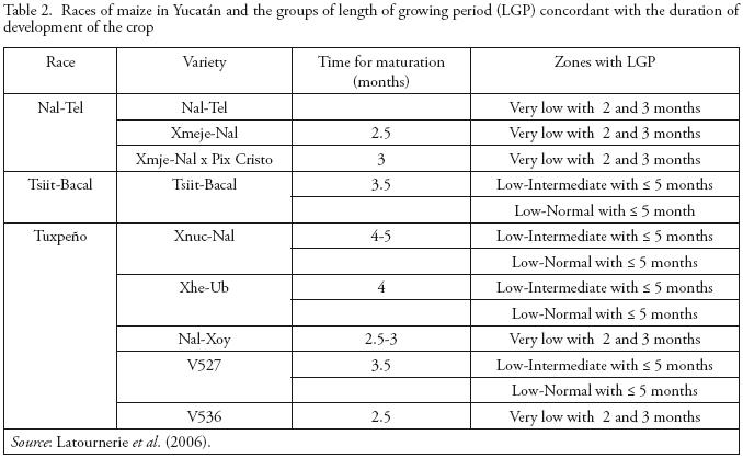 The LGP in Yucatán can be used in planning rainfed agriculture, for example in the case of the varieties of Creole maize with a GP of seven weeks such as NalTel, two to three months such as XmejenNal, three and onehalf months such as TsiisBacal, from four to five months such as XnucNal (Tuxpeño), etc. Also there is great diversity of local races and varieties of beans, pumpkins and chilis that accompany these maize crops in the cultivation of the milpa and which have similar requirements (Terán and Rasmusen, 1995; Latournerie et al., 2001). However, some farmers nowadays only sow the variety XnucNal, which has a 4month cycle, saying that the tradition of sowing those with a short cycle has died out for three reasons: a) they are a source of food for wild animals, b) the product is stolen by other people and c) because of these problems the farmers have not saved the seed.