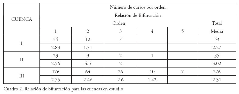 Relación de bifurcación: Gil (2009) analizó que los valores bajos (valores cercanos a 2) suelen corresponder a cuencas de menor pendiente. Según Senciales (1999) las altas relaciones de bifurcación indican áreas de fuertes pendientes con rápida concentración de la escorrentía, pero con picos de crecida poco importantes y los bajos valores suelen presentar los más altos riesgos de inundación por concentración brusca de la escorrentía. En las cuencas naturales, los valores cercanos a 2 revelan áreas de escaso relieve (siendo casi imposible índices inferiores a 2) valores entre 3 y 5 corresponde a áreas de montaña sin demasiado control estructural y valores superiores a 5 indican fuerte dependencia de la estructura. Los valores medios de la relación de bifurcación obtenidos para las tres cuencas se transcriben en el Cuadro 2.
