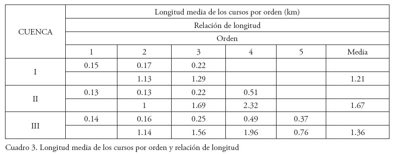 Relación de longitud: según Senciales (1999) altas Rl (Rl > 3) revelan una concentración paulatina de caudales a lo largo del colector principal, mientras que bajas relaciones (Rl < 3) muestran mayor energía concentrada bruscamente (Sala y Gay, 1981). Si se retoma al análisis de los valores medios de las Rl se observa que las tres cuencas estudiadas poseen características torrenciales. El Cuadro 3 muestra los valores que alcanza cada razón calculada.