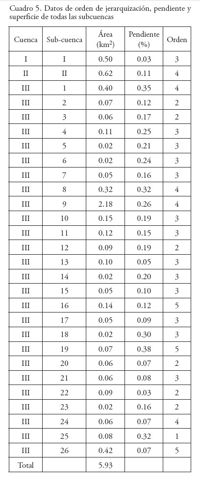 Cálculo de pendientes y áreas incorporando la división en subcuencas: se calculó la pendiente de cada una de las pequeñas subcuencas en que se dividió la cuenca III. En el Cuadro 5 se presentan los valores de pendiente y número de orden para las subcuencas del área en estudio, incorporando las ya calculadas de las cuencas I y II.