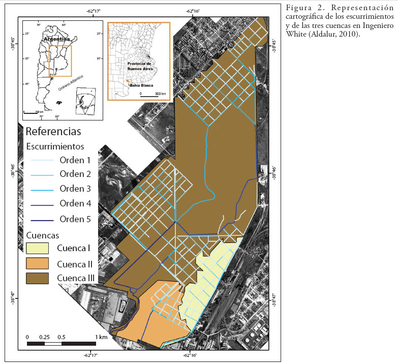 Para la cuenca urbana se siguió el mismo criterio; se marcó el flujo del agua a través de las calles. Esto se hizo a partir de la carga en el SIG de los datos de altura provistos por 19 planos de proyectos de cordón cuneta de toda la zona en estudio, suministrados por el Departamento de Vialidad de la Municipalidad de Bahía Blanca. Esta información fue actualizada y controlada en campo. Se contemplaron los conductos existentes y se los consideró como drenajes conductores del agua. Los canales a cielo abierto construidos por el hombre y los cursos de agua naturales sobre terrenos sin urbanización formaron parte de esta jerarquización.