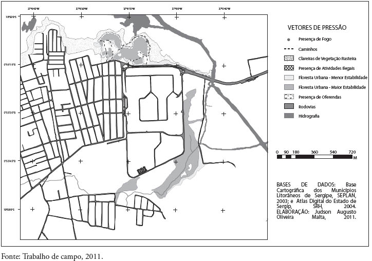 Em seguida, foram realizados outros três trabalhos de campo onde foram coletados, sistematizados e analisados os indicadores abióticos abaixo, após, foi elaborado a carta de uso do solo do entorno da UFS para analisar os fatores de pressão sobre os remanescentes e assim foi produzida a carta de vetores de pressão antrópica sobre cada remanescentes estudado.