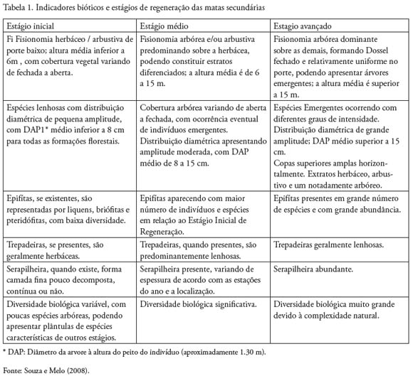 Os indicadores ambientais são um conjunto de parâmetros representativos, concisos e fáceis de inter pretar, utilizados para ilustrar características de uma determinada localidade. Por este motivo, constituemse instrumentos de avaliação, que devem ser adequados às realidades ambientais e socioeconômicas da região a ser avaliada. Pois esses indicadores presentes em maior ou menor intensidade delimitam os diferentes estágios de regeneração em ambientes florestais (Figuras 1 e 2).