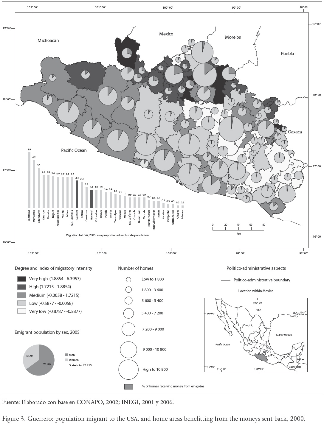 First, the main focus of the political economy of Guerrero has been to boost and consolidate its principal tourist venues, but this has been detrimental to the secondary sector and, in particular, the primary. In recent decades, visitors have been encouraged to come to coastal areas and to places with other tourist attractions apart from the sun and the beach, scattered throughout the seven regions of Guerrero. However, the bulk of the municipalities have benefitted little from the currency that is raised from the influx of tourists, and this has led to a growth in unemployment and the number of people who resort to casual labour related to trade. Also, emigration of Guerrero's inhabitants to other cities of Mexico or to the USA has increased (Díaz and Juárez, 2008). The money these emigrants send back home often vitalizes the economy of the recipient places, and these show greater commercial activity owing to the relative increase in purchasing power of the families that receive the money derived from outside. García Espinoza (2007) reported that, according to national estimates, 80% of the money sent home from elsewhere is destined for daytoday family expenses, 16% for home improvement, and the rest for other items, including savings. Hence, the construction industry, and the labour force associated with it, is intensified in response to the heightened demand.