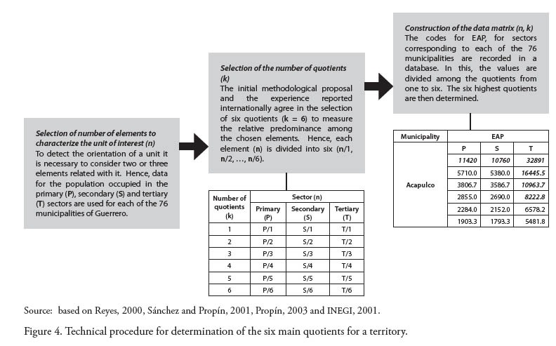 Diverse geoeconomic studies have shown the specialization of regions or, in some cases, their productive diversification, by use of the method of successive quotients (Szczesny, 1964; Kostrowicki, 1970; Kulikowski and Szyrmer, 1974; Propín et al., 1985). This technique was developed in the Institute of Geography of the Polish Academy of Sciences and was used initially in the 1970s by the members of the then Commission on Land Use of the International Geographical Union as an alternative to the procedures used in analogous studies conducted in the USA and in Japan (Propín, 2003); the procedure arose in response to the need to reveal the essential performance of a structural phenomenon. A basic concept is that of orientation, a term that alludes to the conjunction of principal elements of a structure and indicators of its tendency or preferential inclination in a determined territorial unit (Sánchez and Propín, 2001). The application of this method to tracing patterns of diversification or productive specialization shown by given spatial entities has led to recognition of the following socioeconomic scenarios.