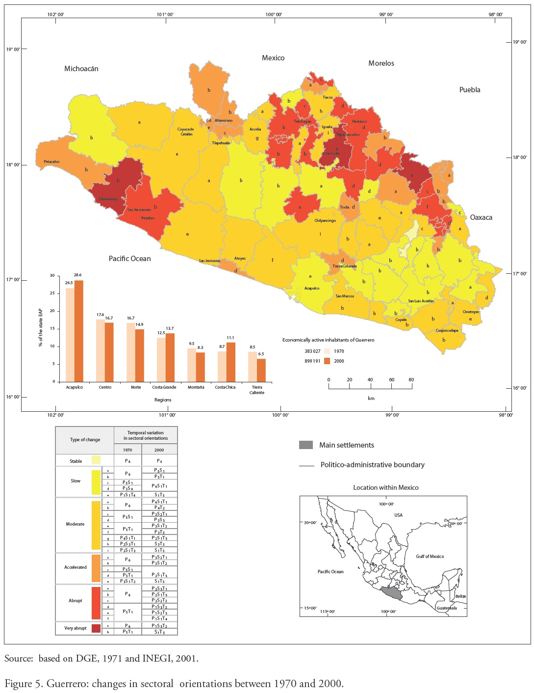 The aim of this study is to demonstrate the changes in the sectoral orientations of the municipalities of Guerrero between 1970 and 2000. During this period, this State underwent significant socioeconomic change: tourism became established as the key component of the State economic dynamic, and various processing plants for USA companies (principally in the northern region) and agroindustries arrived in the Tierra Caliente. The present analysis uses the municipality as the spatial unit of observation, since the statistical method used in the research relies on information regarding the volume of the economically active population (EAP) for productive sectors. Before the 1990s, such data were reported mainly by the National Institute of Statistics and Geography (INEGI) at national, State and municipality level. Nowadays, research can supply greater territorial detail by adopting basic geostatistical areas as units of study. However, this is viable when the period under consideration has as its initial date 1990 or, failing this, it is intended to show the sectoral orientations that have occurred in any territory, in a given year, or in the years that coincide with those corresponding to the later editions of the 10th Census of Population and Vivienda. It was from the eleventh census onwards that INEGI began to register the detailed information, and solely those publications have the variables mentioned.1
