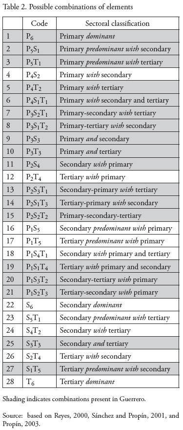 Comparison of the results with the possible codes. Once the six major quotients have been obtained for the 76 municipalities, each economic sector is represented by its uppercase initial letter and its respective number of quotients as a subscript. The combination of three elements (n = 3) and six quotients (k = 6) leads to 28 possible codes that denote a sectoral orientation of any combination ranging from primary dominant (P6), primary predominant with secondary (P5S1), primary predominant with tertiary (P5T1), .........., to tertiary predominant with primary (P1T5), or tertiary dominant (T6) (Reyes, 2000; Table 2).