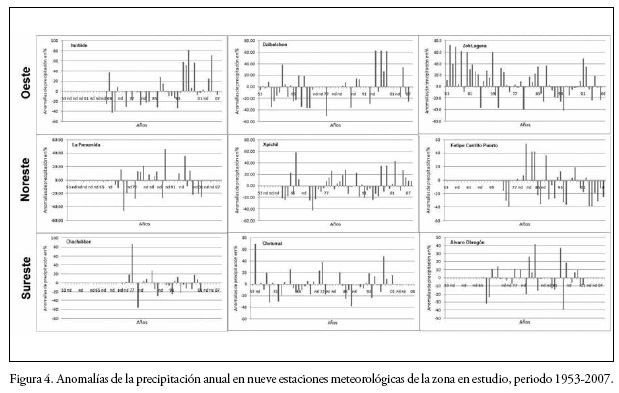 Los resultados muestran una gran variabilidad espacial y temporal de las precipitaciones en el sur de la península de Yucatán durante el periodo 19532007. Los mayores valores de precipitación y anomalías positivas se observan en la costa, la cual se encuentra más expuesta a la influencia de los vientos alisios que transportan masas de aire húmedo y caliente, principalmente en la época de verano, y van disminuyendo gradualmente en dirección hacia el centrooeste de la zona. En gran parte de la zona en estudio se observa una reducción de la precipitación a través de los años, especialmente en la época de lluvias, que llega hasta valores de 12 mm/año en la estación Chachobben. Ya que los años identificados como sequías extremas son distintos en la mayoría de las estaciones, es necesario hacer hincapié en un punto muy importante acerca de las características espaciales de la sequía. Aun cuando la sequía puede afligir a una región en general, sus efectos específicos en una población o área en particular, pueden ser muy impredecibles. Los motivos principales de la disminución de la precipitación en la zona podrían ser diversos, y podrían o no estar relacionados al cambio climático antropogénico surgido gradualmente desde la revolución industrial (Wisner et. al., 2007). Investigaciones establecen como principal causa el Cambio Climático Global, refiriéndose generalmente al calentamiento global que puede presentar una relación inversa o directa con la disminución de lluvias, dependiendo de las características climáticas y ambientales de cada región (Heller y Muthukumara 2002; Wisner et. al., 2007; Burgin y Berdegué 2009).