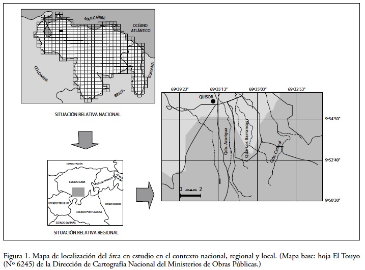 La investigación se llevó a cabo en la depresión del Valle de Quíbor, localizada en la Parroquia Juan Bautista Rodríguez del Municipio Jiménez en el Estado Lara en Venezuela, más específicamente en la cuenca medioalta de la quebrada Los Barrancos, enmarcada dentro de las coordenadas geográficas de los 09º 52' 53" 09º 55' 53" N; y 69º 34' 53" 69º 36' 33" O (Figura 1).
