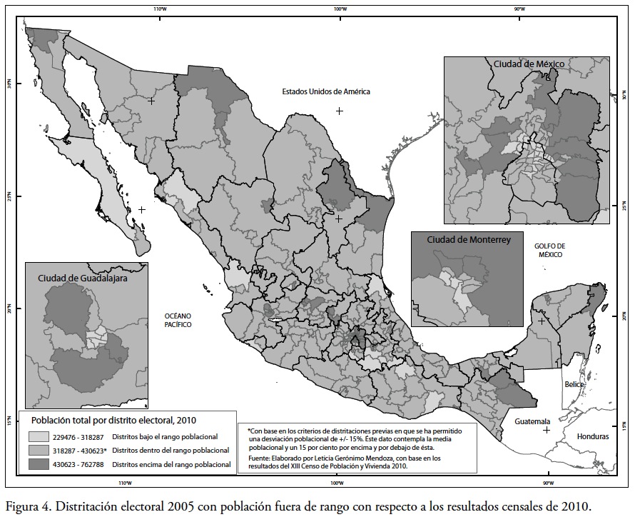 Finalmente, una mención especial requieren las grandes ciudades del país. En primera instancia, los estados de Jalisco y Nuevo León, que cuentan con las zonas metropolitanas más grandes después de la Ciudad de México. En éstas, la consolidación y crecimiento de la mancha urbana son indiscutibles; por ejemplo, para el estado de Jalisco, en 1977 su área metropolitana se encontraba conformada por ocho distritos, que en 1996 se convirtieron en diez y finalmente para 2005, la zona se encuentra conformada por 12 distritos. Por su parte, en Nuevo León, la zona metropolitana de Monterrey ha aumentado de siete a ocho distritos en los ejercicios distritales de 1977 con respecto al de 1996, para configurarse finalmente con nueve distritos en 2005. En este sentido será interesante estudiar la evolución que presentaran en la Distritación Federal de 2013, donde se podrá observar si las ciudades continúan creciendo, o han consolidado ya su máxima expansión. Caso opuesto a lo ocurrido en la Ciudad de México en la cual el Estado de México ha crecido en detrimento del Distrito Federal.