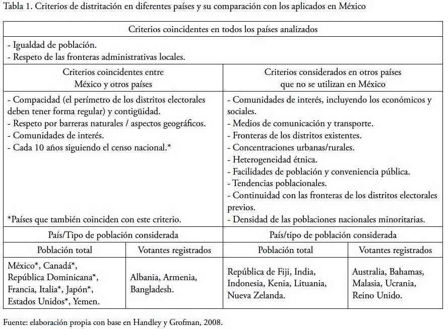 La Tabla 1 muestra el resumen de un análisis realizado a 60 países, incluyendo a México, en relación con los criterios que se aplican para la división de circunscripciones uninominales o distritos electorales, en él se hace una subdivisión de criterios de segundo orden y se identifican aquellos países coincidentes con México, así como de otro grupo que diverge; en ambos casos se señala la población objetivo.