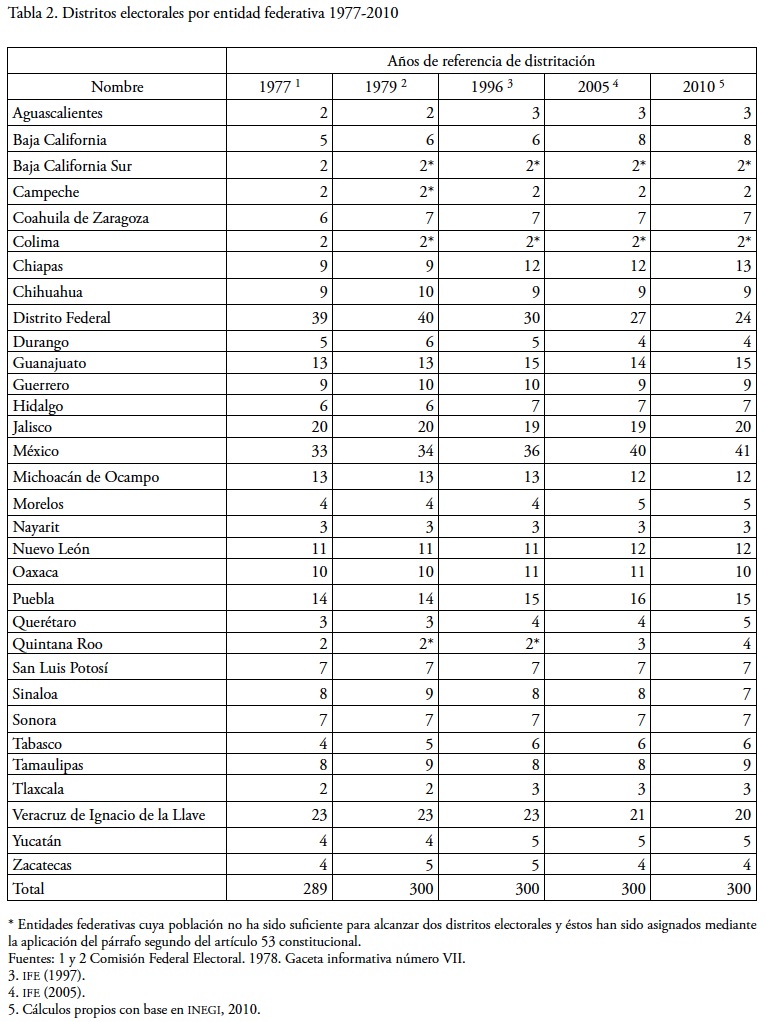 El crecimiento natural de la población, aunado a los flujos migratorios nacionales e internacionales conlleva al incremento y decremento del número de habitantes en las entidades federativas y municipios, por consiguiente a la reasignación de distritos electorales a los mismos. La Tabla 2 muestra el comparativo histórico del número de distritos que han correspondido y corresponderán a cada entidad federativa desde 1977 hasta posiblemente el 2021. El número de distritos electorales asignados a cada entidad federativa y al Distrito Federal se puede clasificar en los siguientes cinco grupos: