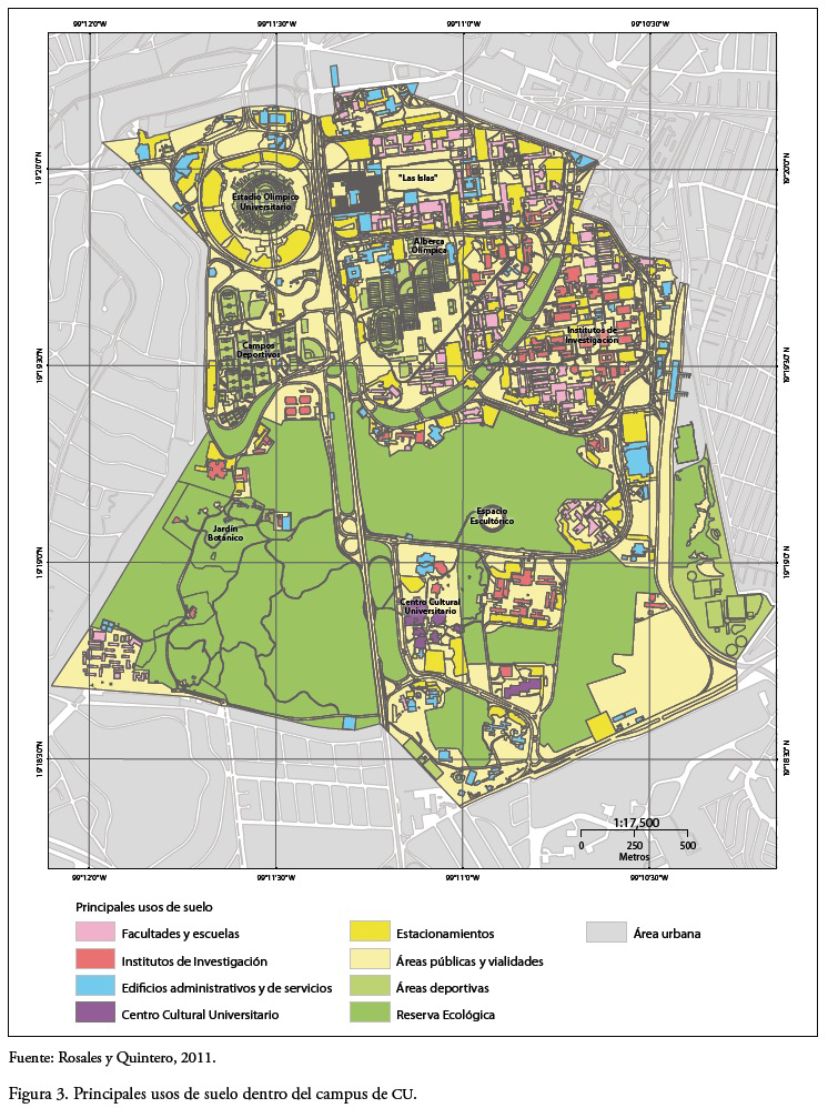 Rosales Tapia, A. R. y J. A. Quintero Pérez (2011), "Mapa de Ciudad Universitaria, Universidad Nacional Autónoma de México", escala 1:5 350, como poster y en: http://132.248.26.6/website/cu/.