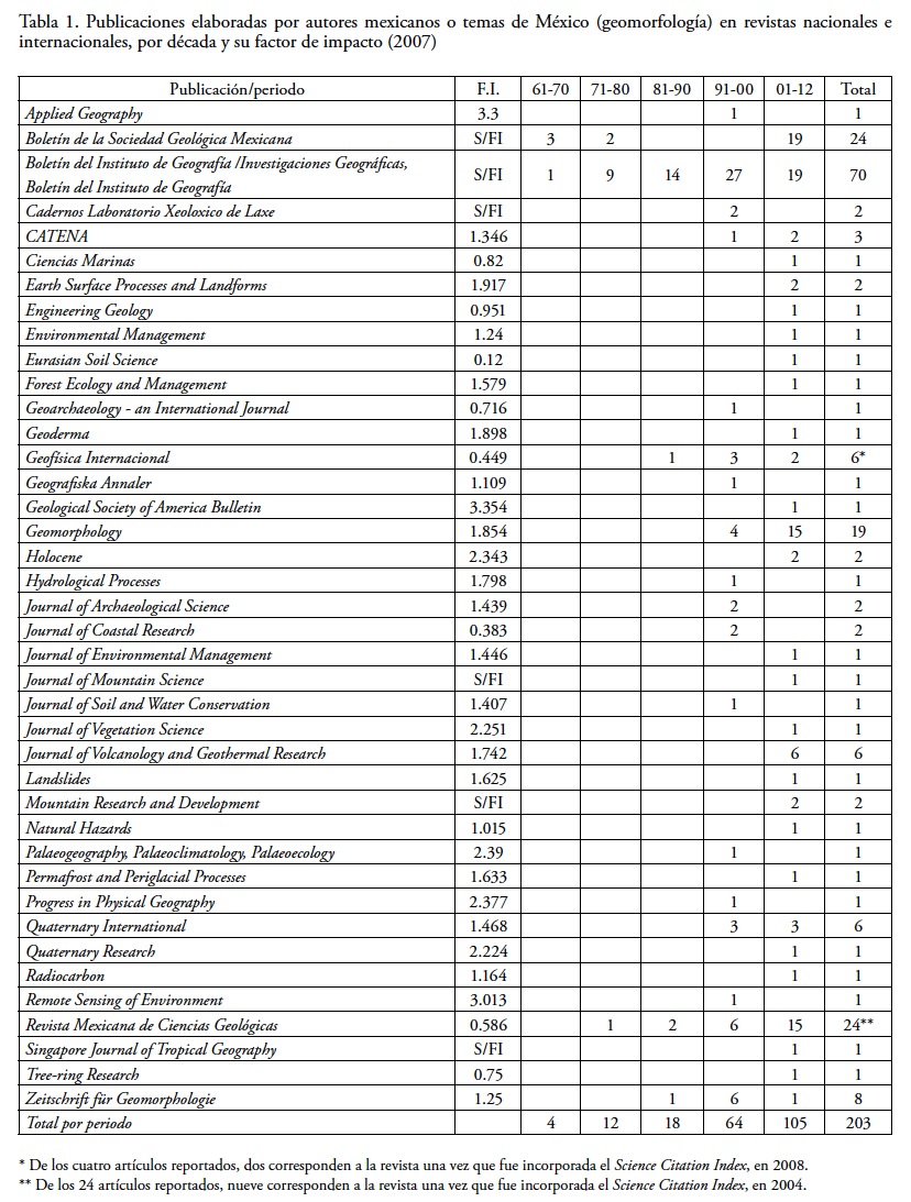 La Tabla 1 incluye las 37 revistas en las que se detectó un total de 203 trabajos elaborados por geomorfólogos mexicanos; cuatro de dichas publicaciones son mexicanas y el resto extranjeras. En los casos donde procede, se refiere también el factor de impacto correspondiente (JCR Science Edition) y se cuantifica la publicación de los trabajos por decenio, desde los años 1960 hasta la actualidad (2012).