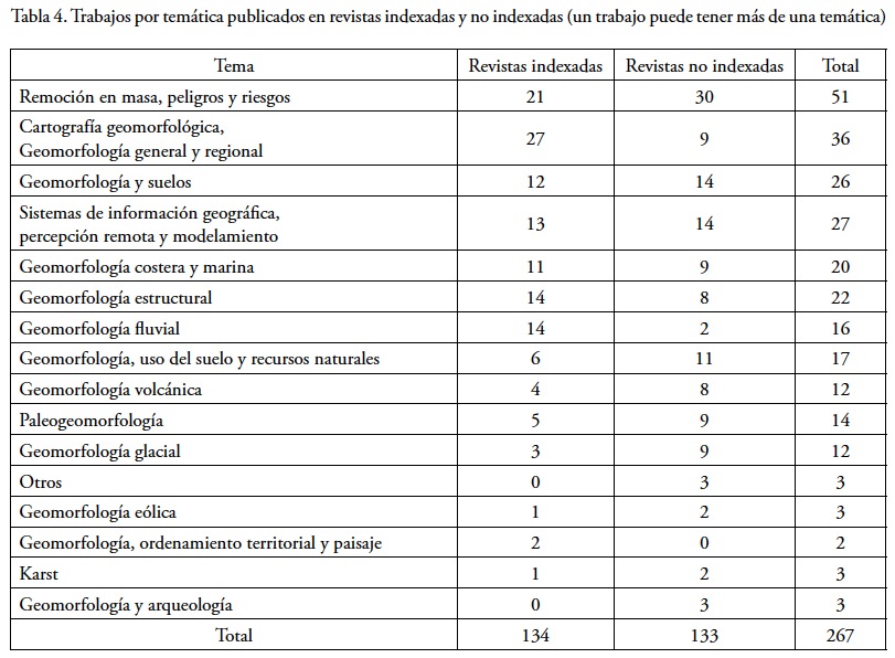 En tercer lugar, los temas de investigación señalados para las publicaciones de circulación nacional no difieren de aquéllos incluidos en las revistas de circulación internacional (Tabla 4). Destaca fundamentalmente la geomorfología aplicada y la cartografía geomorfológica como herramienta (remoción en masa, en primer lugar y comparativamente con menor ocurrencia, los temas de erosión de suelos, aptitud territorial y planeación), así como los trabajos de geomorfología estructural por parte, principalmente (pero no solo) de colegas del área de las ciencias geológicas. Una buena cantidad de trabajos aborda problemáticas paleoambientales con una perspectiva geomorfológica. Los temas abordados en las publicaciones que se analizan fueron identificados y se refieren en la Tabla 4.
