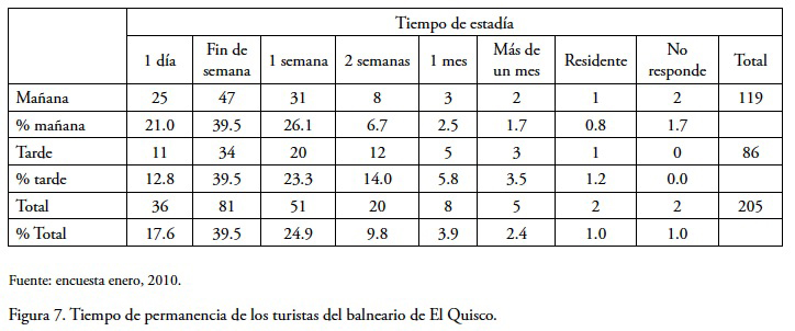 Se puede constatar que el 40% de las personas permanece en el balneario solamente por el fin de semana durante el verano, lo que es coherente con los altos niveles de población flotante que se registra en el lugar (Figura 7). Otro 25% de los visitantes permanece una semana en el lugar y finalmente un 17.6% de los visitantes asiste al balneario solo por el día.