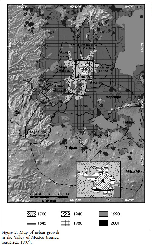 Gutiérrez de MacGregor, M. T. (1997), "Crecimiento espacial de las principales ciudades", Atlas Nacional de México, sec. III, tomo I, Instituto de Geografía, UNAM, México.