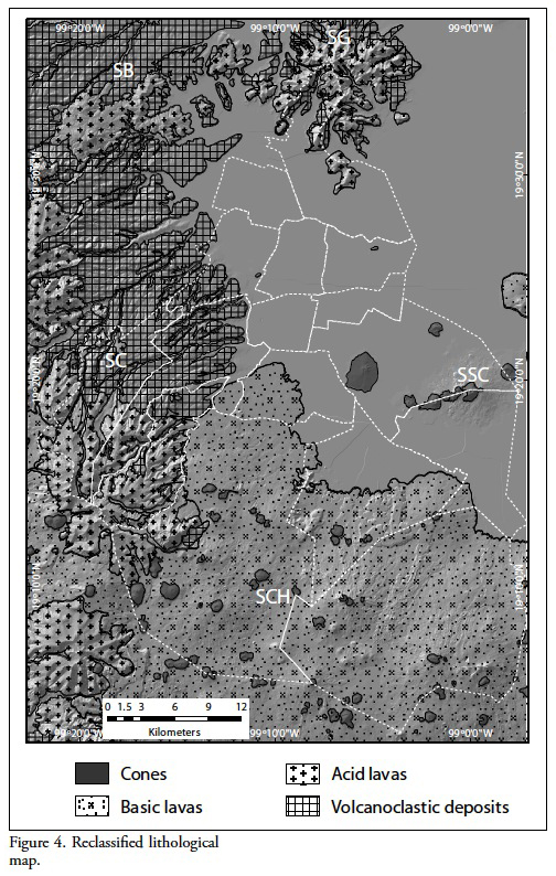 Considering the scale of work used and the geological characteristics of the material forming the mountainsides, the existing lithological map (SEGEOMET, 2005) was reclassified in order to obtain a simplified integrated version for four types of material (Figure 4): a) acid and intermediate lavas (andesites and dacites), b) basic lavas (basaltic and basalticandesite lava spills), c) scoria cones and d) granular and blocky materials (volcaniclastic deposits).