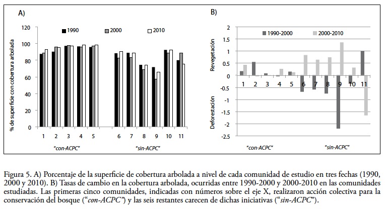 Tanto la ganadería como la migración podrían haber influido en las tendencias observadas; sin embargo, las comunidades con-ACPC están conservando sus bosques de manera intencional. Asimismo, están haciendo planeación y tomando acuerdos que sugieren que la actitud conservacionista podría mantenerse en el futuro. Entre los acuerdos está la prohibición de desmontar bosques maduros para los cultivos, y la recuperación de áreas agrícolas que quedaron dentro de las zonas de conservación (Bray et al., 2012). En contraste, no es claro que tanto las tendencias de cambio en la cobertura arbolada de las comunidades sin-ACPC pueda mantenerse en el largo plazo, y además ante la falta de prácticas de cuidado de los bosques (como hacer guardarayas para prevenir incendios o regulación de áreas de pastoreo, de extracción doméstica o conversión de bosque a milpas), éstos podrían deforestarse o degradarse (tener menor densidad de árboles, disminución de diámetros o perder especies de importancia ecológica; Boucher et al., 2011).