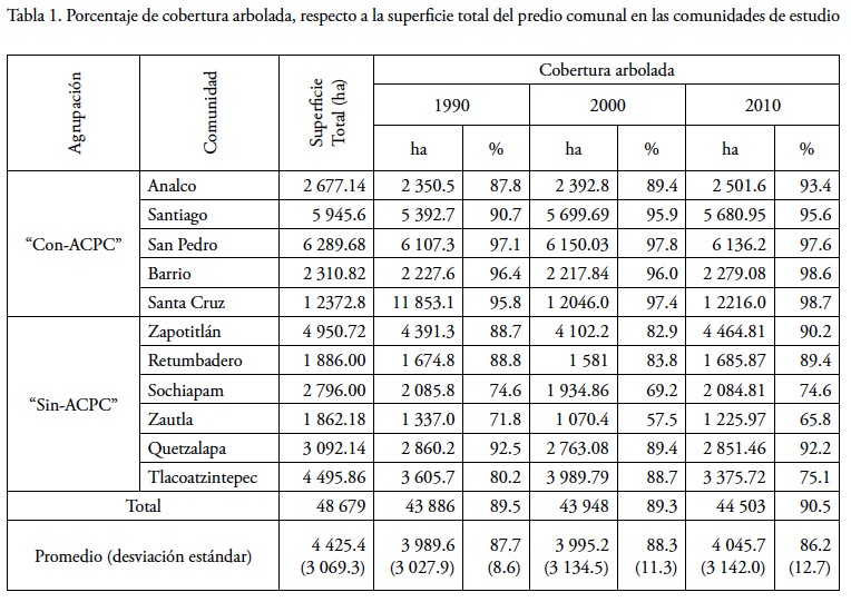 Las unidades de estudio del presente trabajo fueron once comunidades de la etnia Chinanteca que contrastaron en su acción colectiva para la conservación del bosque (Bray et al., 2012). El objetivo fue analizar la dinámica de su cobertura arbolada entre 1990-2010, y comparar las tendencias de cambio entre cinco comunidades que realizan acción colectiva para la conservación del bosque (con-ACPC) y seis que carecen de dicha acción colectiva (sin-ACPC).