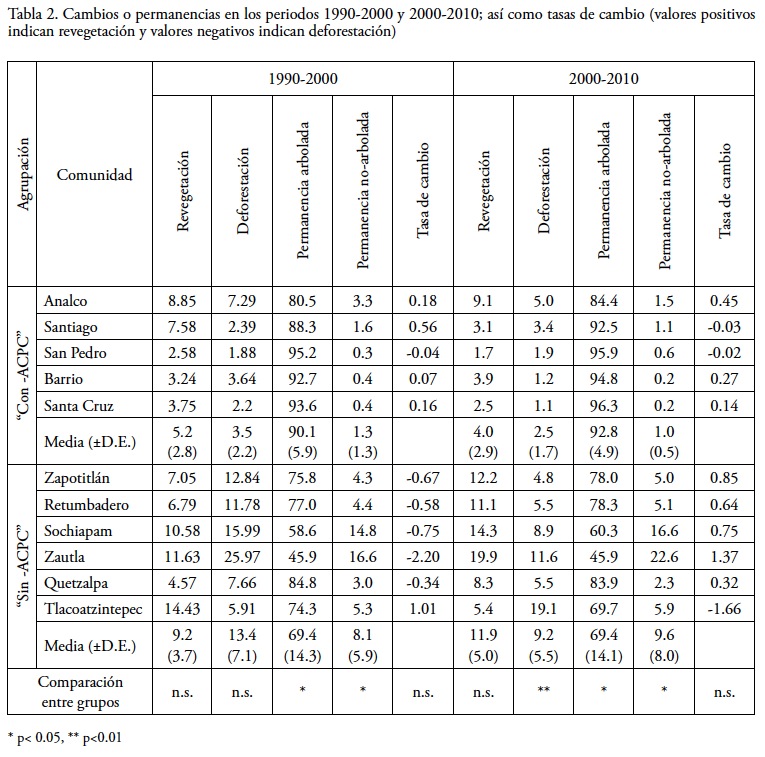 La revegetación y la deforestación ocurrieron en todas las comunidades durante el periodo de análisis (Figura 3). Las comunidades sin-ACPC mostraron mayor dinamismo en ambos procesos de cambio (valores promedio más altos y mayor desviación estándar) que las comunidades con-ACPC. Sin embargo, solo se encontraron diferencias significativas en la deforestación entre ambos grupos de comunidades para el periodo 2000-2010 (Tabla 2). En cuanto a las tasas de cambio, entre 1990-2000 el valor promedio fue r = -0.24 (± 0.84), lo que sugirió que la deforestación prevaleció (Tabla 2, Figura 5b), pero esta tendencia se revirtió en el periodo 2000-2010, cuando el valor de la tasa de cambio fue positivo (r = 0.28 ± 0.76). Entre 1990-2000, seis comunidades se deforestaron (tasas de cambio negativas); de ellas, cinco fueron del grupo sin-ACPC, y en la siguiente década todas se revegetaron (Tabla 1; Figura 5b). Tlacoazintepec (sin-ACPC) fue la comunidad que tuvo la mayor revegetación entre 1990-2000 (r = 1.01), pero una década después presentó la mayor deforestación (r = -1.66). Aunque en general hubo valores más bajos en las tasas de cambio en las comunidades con-ACPC, las diferencias entre ambos grupos no fueron estadísticamente significativas.