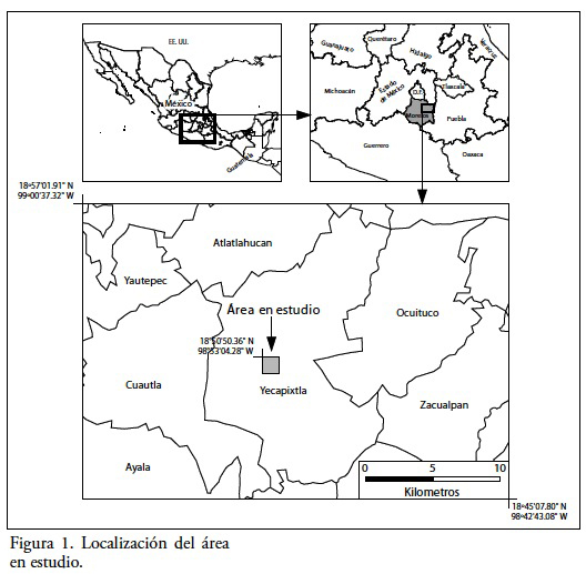 La zona en estudio (Figura 1) se encuentra ubicada en el municipio de Yecapixtla, Morelos, México, y forma parte de un corredor para el cual se elaboró un estudio topográfico para la construcción de infraestructura por encargo de una empresa paraestatal mexicana; y se delimita por las coordenadas 18º50'50.36" N, 98º53'04.28" W; UTM WGS84 Zona 14 Norte: 512165 E, 2083938 N en la esquina superior izquierda, y 18º50'09.66" N, 98º52'21.60" W; UTM WGS84 Zona 14 Norte: 513415 E, 2082688 N en la esquina inferior derecha, formando un cuadrado de 1 250 x 1 250 m. El área cuenta con variada topografía (Figura 2) con un rango de elevaciones entre 1 492 y 1 586 m snmm. Es predominantemente plana al norte y montañosa al sur, y por lo tanto presenta las características apropiadas para evaluar el desempeño de diferentes métodos de interpolación en diferentes tipos de terreno.