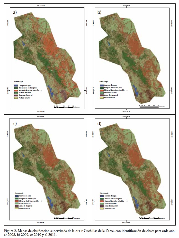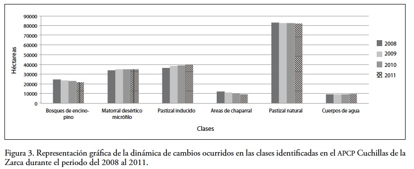 Derivado de la clasificación supervisada se obtuvieron datos de tasa de cambio basados en un periodo de cuatro años, mostrando una disminución gradual de la superficie de las áreas de chaparral con un cambio de 661 ha anuales, para una pérdida 2 644 ha (22.3%) en el periodo analizado, seguido de los bosques de encinopino con una tasa de cambio anual de 795.6 ha (6.7%) y por último el pastizal natural con 296.7 ha y una tasa de cambio de 0.35%. Posteriormente se identifica un aumento en la superficie ocupada por el pastizal inducido 3 523.7 ha (9.7%) y del matorral desértico micrófilo con 1 204.6 ha (3.5%). En el caso de los cuerpos de agua se encontró una disminución de 131.5 ha (1.44 %) entre el 2008 al 2010, sin embargo, en 2011 hubo una aumento de 571.33 ha (6.2%; Figura 3). De acuerdo con los datos publicados por el Servicio Meteorológico Nacional de CONAGUA (2013), este fenómeno obedece al comportamiento de los datos mensuales de afectación por sequía en México, donde específicamente en el periodo de lluvias del 2010 hasta principios de 2011, el porcentaje de afectación por sequía en el área en estudio fue bajo, mostrando afectaciones de datos anormalmente secos y sequía moderada, lo cual permitió que los cuerpos de agua temporales se mantuvieran por un periodo de tiempo mayor. Velázquez et al. (2010) encontraron que los cambios de las coberturas del suelo sin disturbio que no evidenciaban cambio al inicio, presentaron una tasa de cambio de 13.7% en relación con las coberturas de uso de suelo con algún disturbio, las cuales tuvieron una recuperación 6.7%. Caciano et al. (2011) mencionan que de acuerdo con las actividades humanas en el área natural protegida Sierra de Los Lobos, Guanajuato, ha disminuido un 10.5% de superficie agrícola de temporal, de manera contraria, se incrementó la superficie de matorrales y pastizal inducido con una tasa de cambio anual de 10.9%. Por otra parte, en un estudio realizado en el noroeste de Turquía se encontró una disminución del 33.5% de las áreas forestales, mientras que las áreas agrícolas tuvieron un incremento del 11.2%; los cambios se deben a la rápida urbanización y actividades agrícolas (Ikiel et al., 2013).