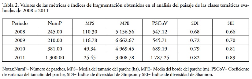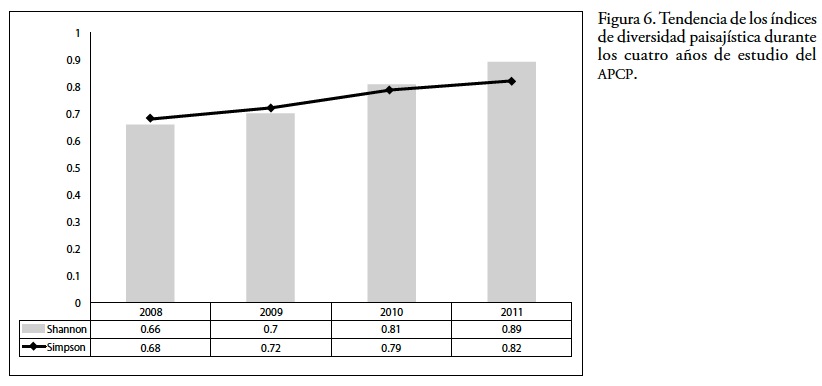 índices de diversidad. De acuerdo con el análisis efectuado a las clasificaciones de las imágenes satelitales para los periodos evaluados, tanto el índice de Simpson así como el de Shannon, tienen una clara tendencia ascendente. El índice de Simpson muestra que conforme avanza el tiempo existe una mayor diversidad paisajística; por otra parte, el índice de Shannon nos da como resultado que del 2008 al 2011 está incrementándose el número de fragmentos de cada clase. En ambos casos se muestra una evolución paisajística debido al incremento de los parches que presentan un claro proceso de fragmentación en el área en estudio (Figura 6). Wu et al. (2013) en su estudio en comunidades de pastizal del noreste de China, encontraron que el número de grupos funcionales de plantas mostraron respuestas distintas debido a la fragmentación; el aumento de la diversidad era producto del aumento de la fragmentación.