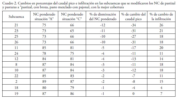 Para las subcuencas (24, 12, 8, 10, 22, 2, 18 y 19) que cambian el NC entre 1 y 4%, el caudal pico disminuye entre 0 y 13%, mientras que la infiltración aumenta entre 4 y 18%.