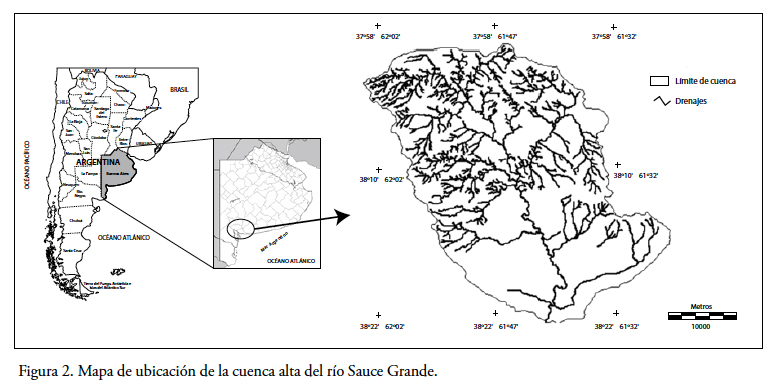 El trabajo se realizó para la cuenca alta del río Sauce Grande, en una superficie de 1 032.66 km2, la misma se extiende desde su naciente en las sierras del Sistema de Ventania hasta el Dique Paso de las Piedras (Figura 2). Está compuesta por dos elementos morfológicos fundamentales: las sierras y la llanura circundante. La distribución de estas unidades y su homogeneidad geológica se reflejan en el marcado contraste de llanuras, con pendientes de hasta el 4%, y el abrupto pasaje a la zona serrana, cuyas pendientes críticas exceden el 48%.