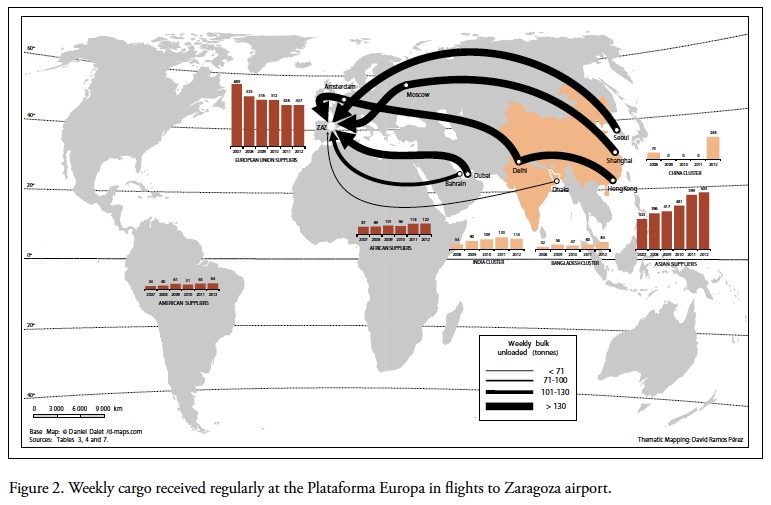 Cargo flights for Inditex arrive at Zaragoza Airport from Asia and the Middle East carrying garments made in the Asian supplier clusters and factories. The use of air transport indicates that these can be high-fashion-content products and that air transport facilitates bringing them to the market quickly (Figures 2).