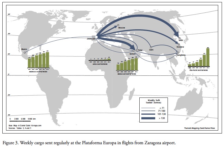 Outgoing flights take the finished garments to the shops in the Asian and Middle Eastern markets. Additionally, in August 2012, a regular service to Mexico began to deliver to the Central and North American markets. Mexico is one of the countries that has leveraged its proximity to the North American market to develop competitive advantages in transport and logistics services. All of the routes developed go to highly dynamic markets in emerging countries (Figures 3).