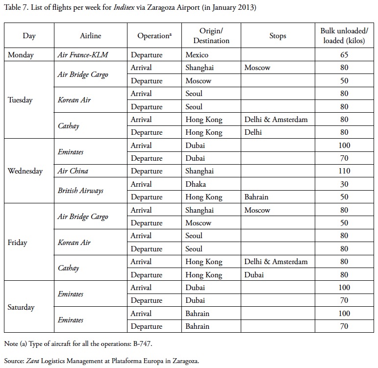 Finally, we have provided details of how the Inditex group completely centralises the distribution of its products to shops. The data for the Zara logistics hub in Zaragoza illustrate and highlight the value given to time in the company's activities and how this consideration influences the organisation of the flows in and out of the hub. Air transport is used to send garments to distant markets and also for the reception of high-fashion-content garments from the Asian clusters and for their quick delivery to various markets despite the distance.