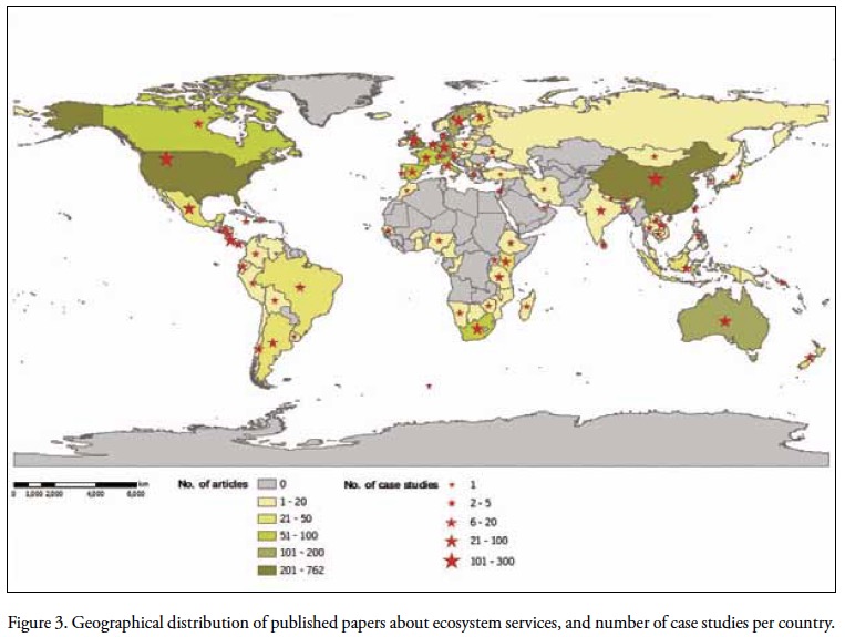 Similarities between the geographical distributions of the two variables can be perceived in areas that issue moderate quantities of papers, especially Canada and European countries. Many developing countries show very low article production as opposed to moderate or high numbers of case studies, for instance in central America (with the remarkable case of Costa Rica), East and southern Africa, and South-East Asia; these are all regions with high levels of biodiversity. Costa Rica's distinctiveness is due to the fact that it was the first country in Latin America to implement payments for Ecosystem Services (PES) schemes (in 1996), and it has often been taken as an example to follow or to analyse. Lastly, it is interesting to observe that two case studies have been reported from Bangladesh and four from Uganda, although no paper publication has been observed for either country.