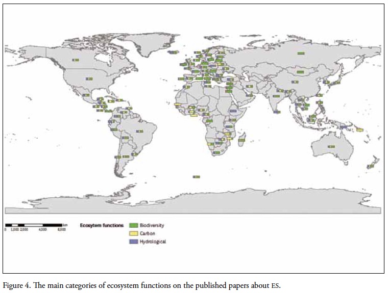 Geographically, ES research appears concentrated in North America, Europe, China and Australia, with social and economic focus of analysis predominat; followed by physical and interdisciplinary approaches. In the relation to the ecosystem function, the biodiversity studies prevail, followed by hydrological and carbon. Developing countries have published moderate or low amounts of papers, but are often the areas of interest for outside research. It is important to highlight that half of the papers are focused on one or more study cases, which allows for better understanding and analysis of local issues. Moreover, applied research combines experiments, sampling, surveys and interviews. It all contributes to providing better quality and more quantity of information for a successful study.