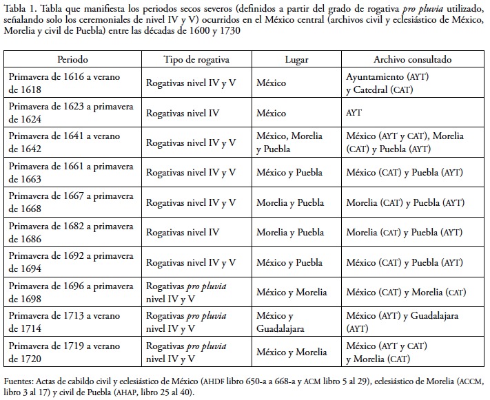 Comparing instrumental climatic sources with proxy data, in order to review existing climatic models and to acknowledge climatic variability in time and space, is widely recognized nowadays. In Mexico the study of past climate along the last 500 hundred years, has mostly been conducted through the analysis of instrumental sources. Studies that have 1877 as time limit, when the first continuous records started to be taken in Mexico City. For the study of climate along the last centuries, documentary sources have proved their accuracy, if compared to physical and biological data, usually modified by human activity. Tree ring information is among biological sources also useful for recent centuries, but in Mexico it is still necessary to have a better regional coverage. The Little Ice Age (LIA) was defined back in the 1930s through information gathered in North America and Western Europe, but much is still unknown about the climatic behavior of lower latitudes in the Northern Hemisphere and the Southern one during LIA. The reconstruction of past climates, through documentary sources started under scientific principles, only until the mid 20th century and it was a task conducted mostly by British and French authors. Emmanuel Le Roy Ladurie, recognized French historian, was the first to reveal to the world in the early 1960s, the documentary source that has resulted more precise for climatic reconstruction within the Hispanic cultural realm: the record of the rogation ceremonies. But it was not until the 1990s, when Spanish researchers like Mariano Barriendos, Javier Martín-Vide or Fernando S. Rodrigo, published and disseminated outside Spain, the climatic data obtained at City Councils and Cathedrals throughout the Iberian peninsula. In Mexico this kind of work started to be achieved by 2001. Rogation ceremonies are a reliable source of ancient climatic variability, because of its public and institutional origin, and their homogeneous information and precise dating.