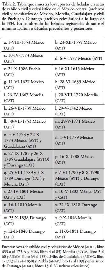 La primera pregunta que surge ante el tratamiento documental del mínimo Dalton, desde el México central es: ¿Por qué el mínimo Maunder, considerado más frío a escala global (Casey, 2011:31), provocó menos periodos secos que el mínimo Dalton? Parte de la respuesta se tiene tomando en cuenta una PEH que es primero húmeda y luego seca. Pero dadas las características climáticas del México central y meridional no debería haber menor precipitación ante condiciones oceánicas más frías, lo cual nos lleva a pensar que el detonante de mayores sequías y heladas más frecuentes en las tierras altas mexicanas no es necesariamente una ausencia más acusada de manchas solares que se manifieste en temperaturas más bajas en los mares. En este sentido, cabe recalcar que las heladas severas fueron prácticamente inexistentes durante el mínimo Maunder, mientras que en el Dalton (usualmente definido entre los años de 1780 y 1820) se concentró casi el 50% de las heladas que merecieron ser registradas en actas de cabildo civil o eclesiástico durante la PEH en el México central (Tabla 2).