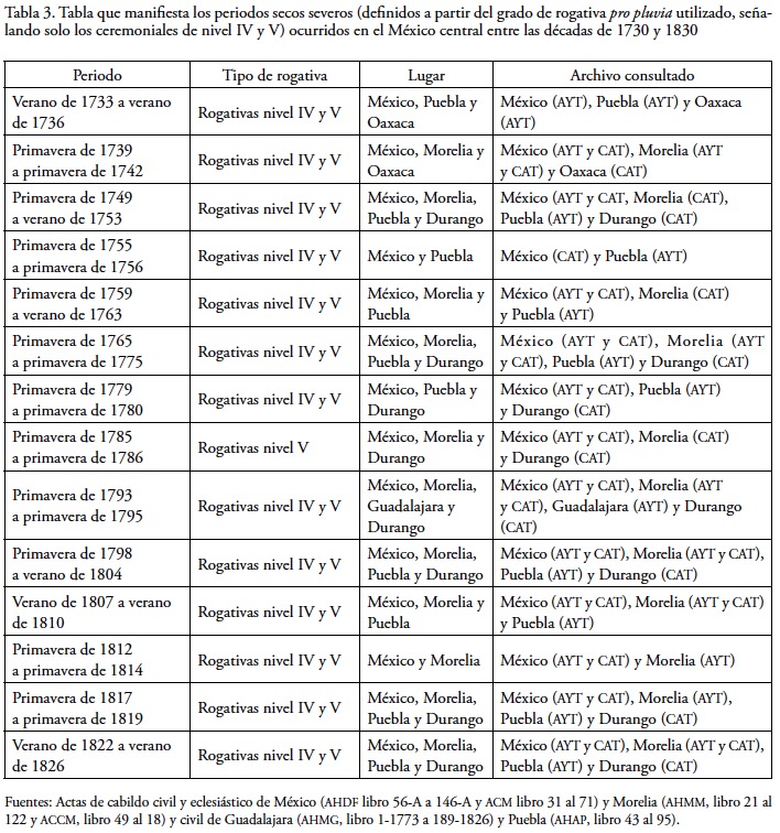 En definitiva, la homogeneidad temática de las ceremonias de rogativa, la datación exacta y la continuidad de los registros conservados en los archivos municipales y eclesiásticos consultados, impulsó el empleo de esta información para la obtención de series con información climática a escala plurisecular. Estos materiales, por otra parte, ofrecen la posibilidad de cuantificar en diferentes niveles de intensidad el tipo de fenómeno por el que se estaba rogando. Así, las sequías el azote más habitual y más perjudicial llegaron a generar cinco niveles de rogativas según la intensidad y duración del episodio. En el caso de la Nueva España, los ceremoniales se condujeron de la siguiente forma: 1. Oraciones en silencio en una sola iglesia. 2. Oraciones en voz alta, en una o varias iglesias. 3. Novenario sin procesión en la catedral o santuario de la advocación elegida. 4. Novenario y procesión en el santuario o procesión, sin novenario en la catedral. 5. Traslado de la advocación elegida de su santuario o altar específico de la catedral al altar mayor de la misma y procesión por las calles de la ciudad. La gradación de este tipo de ceremoniales se infiere de los registros capitulares consultados en los acervos de las catedrales de México, Morelia, Guadalajara, Durango, Oaxaca, San Cristóbal de las Casas y Mérida. Así como de los ayuntamientos de México, Morelia, Guadalajara, Puebla y Oaxaca.